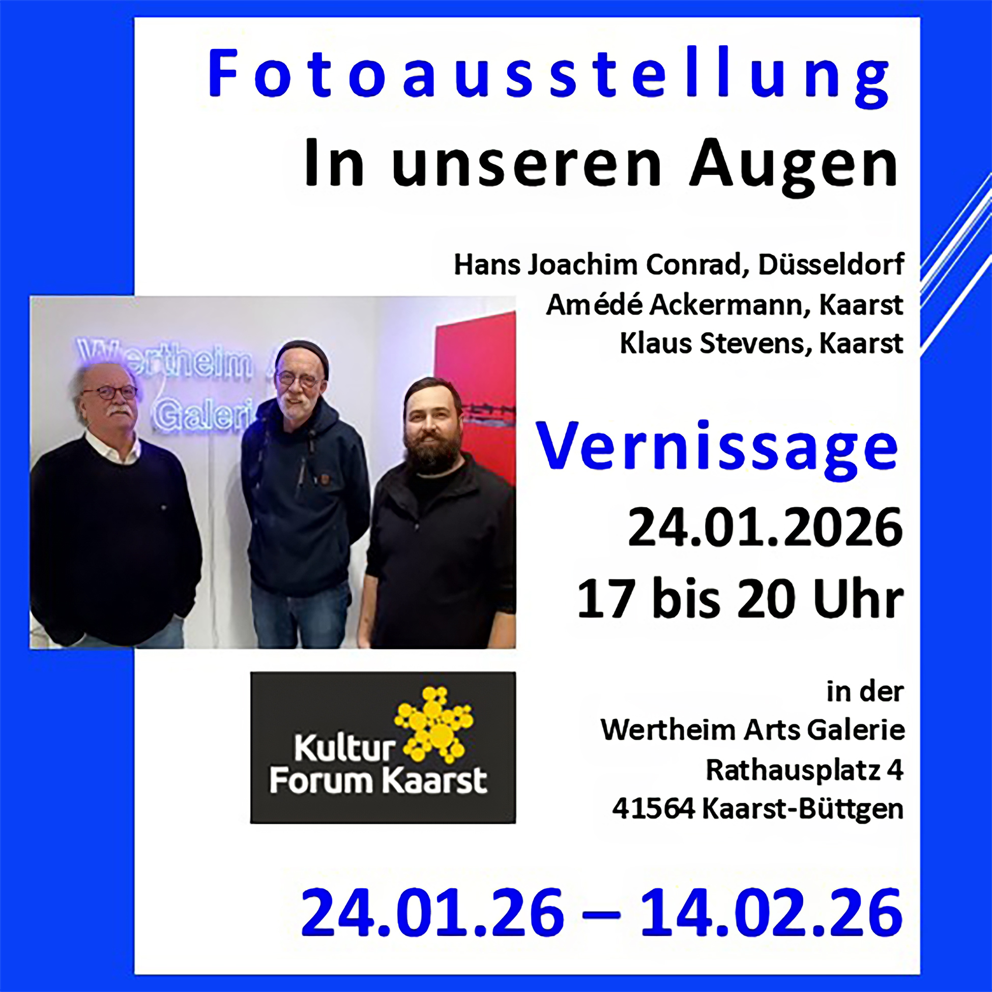 Klaus Stevens, Kaarst, zeigt bewegende, detailreiche Naturaufnahmen. Amédé Ackerman, Kaarst, ist mit Fotomontagen zwischen Realität und Fiktion vertreten und Hans-Joachim Conrad, Düsseldorf, stellt seine abstrakt-impressionistischen Fotos vor. Der Ausstellungstitel „In unseren Augen“ spiegelt ihre gemeinsame Leidenschaft für die Fotografie wider. Die Laudatio hält Hilla Baecker, Leiterin des Kulturbahnhofs Korschenbroich und selbst Fotokünstlerin. Die Ausstellung endet am Valentinstag.